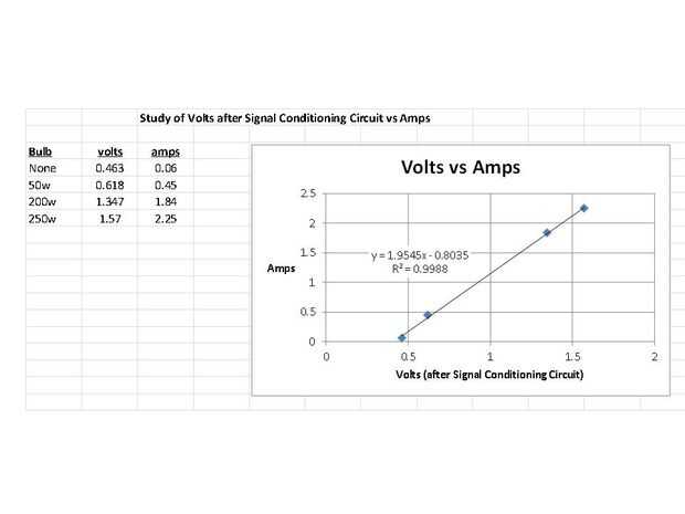 La anterior configuración de prueba, se aplica una variable AC carga y medida AC actual (amperios) y la señal VCC salida. (Ver la tabla de datos que grabé utilizando el foco de 3 vías antes mencionadas) Se trata de los datos de calibración, siendo la v la "X" valor y valor de amperios la "Y".