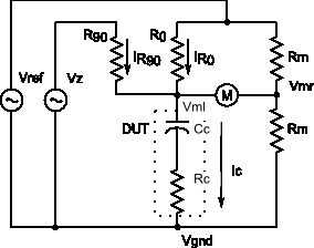 Así, por equilibrio el puente y encontrar el valor de R0 y R90, es sencillo calcular la corriente total a través del dispositivo bajo prueba Ic. Utilice la ecuación final a que llegamos, podemos calcular la impedancia de la capacidad perfecta y la resistencia en serie. Al saber la impedancia del condensador y la frecuencia de la señal aplicada, es muy fácil encontrar la capacitancia del aparato bajo prueba por: