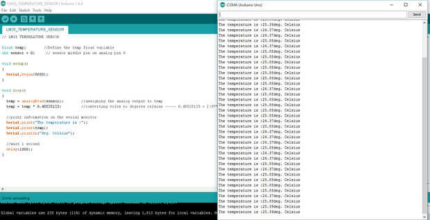 void setup() {Serial.begin(9600); //start the serial monitor} Aquí leemos los datos desde el LM35 utilizando analogread(sensor) y almacenar esta información en la variable temp. El multiplicará este valor con 0.48828125 para convertir de voltios a grados Celsius.