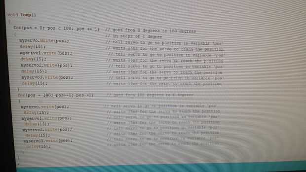 - Este código de ejemplo es sólo para un servo, pero puesto que se utilizan cuatro, tres servos más hay que agregar.