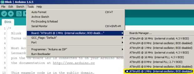 7. ahora vaya a la barra de herramientas superior y configurar ATtiny85 correctamente como un dispositivo de destino Herramientas > Junta Directiva > ATtiny85