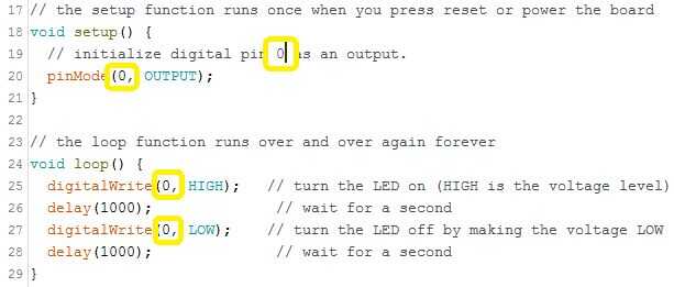 Parpadear bosquejo está conectado con el pin 13 de Arduino Uno. Tenemos que cambiar esto.