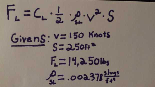 La ecuación de elevación, en la foto superior, le ayudará a determinar qué ángulo de ataque es necesario para mantener el vuelo nivelado. El avión utiliza pesa 14.250 kg y vuela a 150 nudos a nivel del mar presión con un área superficial del ala de 250 pies cuadrados. Los valores por debajo indican lo que representa cada variable en la ecuación.