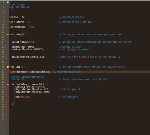 Tiempo para saltar en el código. El código es bastante simple y bien comentado, pero aquí es la verdad, se inicializa todo y comienza un bucle siempre que lee el micValue y comprueba si es menor que el umbral (que se supone que es mayor pero mi circuito era al revés en un sentido). Si pasa el umbral, rápidamente escriba 1, escriba 0 y luego demora durante 1 segundo. 1 segundo retraso es por lo que el flash no ir varias veces (es decir, si el patín rebota). Las líneas 31 y 32 están allí para que mí averiguar los niveles de umbral adecuado, no quiere ser demasiado alto, igual que no desea ser desencadenada por eventos normales como hablar. Lo gelps mucho si el micrófono está en la mesa, así como las vibraciones del impacto de simplificar las cosas. El código debe ser disponible para su descarga aquí.