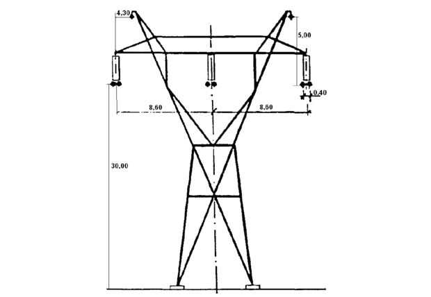 La situación que estoy analizando es una línea de transmisión, fases 3, línea de alimentación de corriente alterna de 50 Hz considerando una tensión de 400kV y una potencia de 1200MVA. Cada fase se compone de 2 conductores (2 maneras "liados"). También hay 2 cables arriba tierra o protector de cables en la parte superior de la torre. Todas las distancias importantes están representadas en la imagen anterior (en metros).