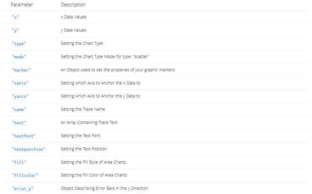 La parte de datos es básicamente un array con todos la trace información de datos, como por ejemplo los puntos X, Y y Z, así como la configuración del gráfico, como el tipo de gráfico y el estilo.