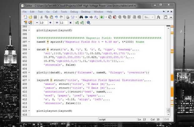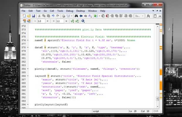 Para enviar información de datos desde MATLAB a plotly podemos utilizar una función de API denominada plotly(). En mi caso, quiero enviar los datos de x, donde X es una matriz, básicamente de la longitud del eje X (40 m para cada lado, siendo 0 en el centro), los datos y, donde Y es también una matriz pero con la altura de la zona (desde el suelo hasta 50 m de alto) y los datos de z, que en mi caso puede ser la matriz 'K' o 'C' (de valores eléctricos y magnéticos respectivamente). Además, yo también le enviará información sobre el tipo de gráfico desea, en este caso es un 'heatmap' y el color me gusta, escalamiento que se define en el campo 'scl'. Así que estos es lo que necesito para escribir: