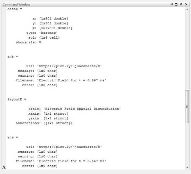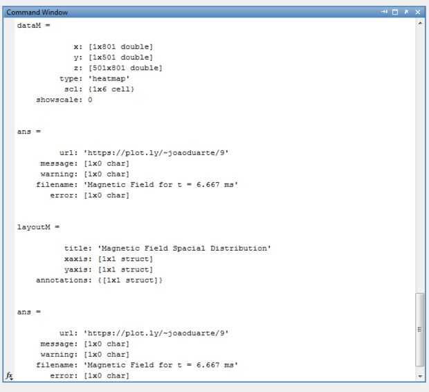La estructura específica del objeto JSON puede ser un poco confuso al principio, y usted necesita respetar para que la API para que funcione correctamente. En caso de dudas, usted debe comprobar la documentación de la API para más información sobre los parámetros específicos de cada función, reglas y otras funcionalidades que no he utilizado en este ejemplo. Usted puede encontrar aquí, no sólo para MATLAB sino para Python, Arduino, Raspberry PI, entre otros. Para obtener información general acerca de los objetos plotly de JSON, consulte la documentación de la API REST.