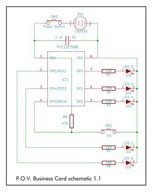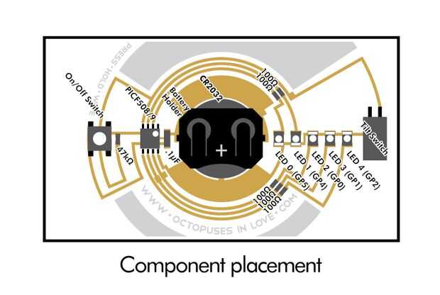 Que la decisión tomada, el resto es fácil, hasta un punto. Aparte de los cinco LEDs y sus resistencias de limitación actuales, un interruptor de inclinación que tira de Pin 4 (GP3) cuando baja la inclinación de la Junta, un condensador de derivación a través del comportamiento de pin 1 y 8 (.1 uF C1) para evitar que la CPU errático y una energía momentánea del interruptor para evitar la descarga de la batería, no hay mucho que se. Es simple, como se había prometido. Y con el programa adecuado, puede hacer nada! Nada en absoluto. El único límite es uno mismo!