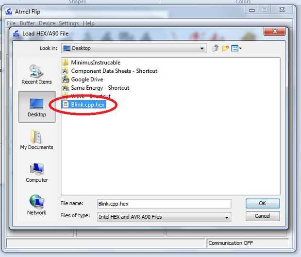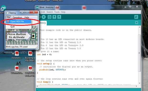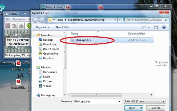 Haga clic en cargar y se compilar pop up con el programa Teensy con botón ' Abrir archivo HEX' haga clic aquí y arrastre al escritorio (o donde que quieres guardarlo). Luego cancelar fuera prog Teensy.