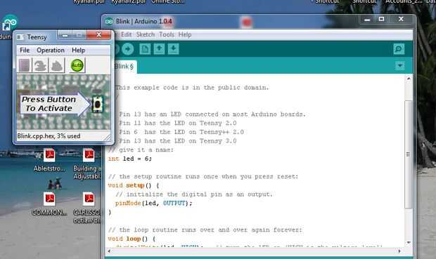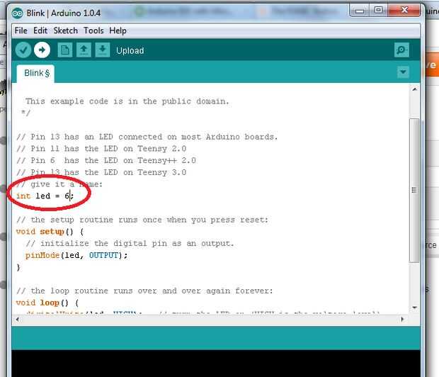 Escriba su bosquejo. Usé el bosquejo de Blink, cambiarlo pin LED 6 LED rojos o 5 LED azul (nota que es alta y baja en LEDs a bordo).
