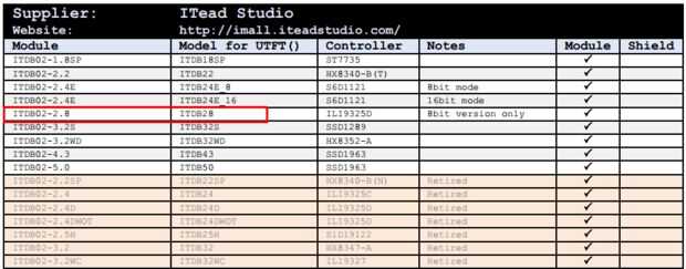 la pantalla tft que utilizamos es el nombre del módulo 2.8 ITDB02 debemos encontrar el nombre de módulo en la biblioteca, abrir el archivo de biblioteca y vaya a la documentación, usted verá tres archivos