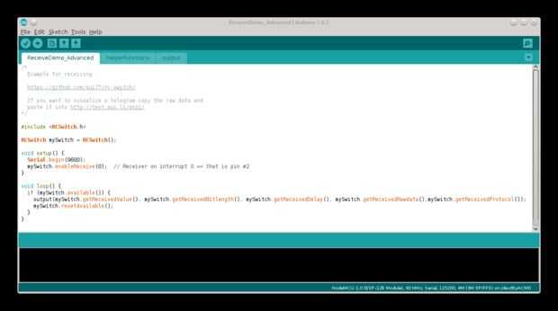 Una vez que tengas esto instalado simplemente puede cargar el ejemplo llamado ReceiveDemo_Advanced. Con este ejemplo subido a tu ESP8266 que debe ser capaces de 'oler' las señales de 433mhz del transmisor que vino con la toma de control remota.