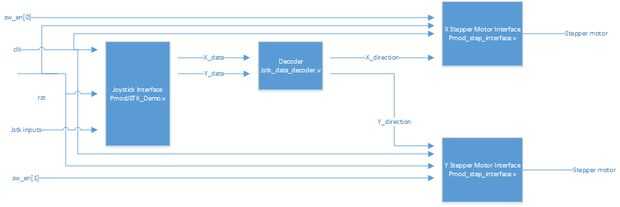 Para conectar las dos piezas de código había añadido un decodificador y utiliza una interfaz de PmodJSTK y dos motores de PmodSTEP. Puedes ver esta estructura en el diagrama anterior. He modificado la interfaz de PmodJSTK para que sólo recibe datos desde el joystick y no enviar los datos a los leds.