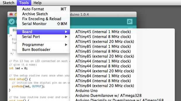 Copiar la carpeta "attiny" (no la carpeta attiny-master) de la master.zip ATtiny descomprimido a la carpeta "hardware". Usted debe terminar con la estructura de la carpeta como documentos > Arduino > hardware > attiny que contiene el archivo boards.txt y otra carpeta llamada variantes. Reiniciar el entorno de desarrollo Arduino. Deberías ver ATtiny entradas en el Herramientas > tablero;