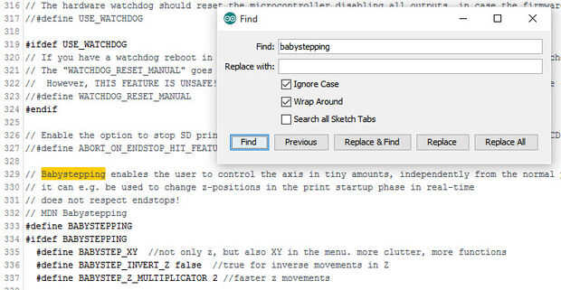 También puede habilitar BABYSTEPPING, que hago a continuación aquí - significa que puede usar su mando de pantalla LCD para mover los ejes en pequeños incrementos para ajustar la impresora después de que haya comenzado la impresión. Muy útil para afinar eje z si está un poco apagado. También hay una opción para definir velocidades de avance cuando se utiliza un ULTIPANEL (lcd).