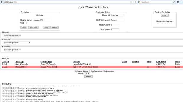De entrada ' / dev/ttyUSB0′ bajo el nombre de dispositivo y éxito botón 'Initialize', entonces vamos a ver nuestro interruptor de z-wave demostrado para arriba en dispositivos de la ficha, nos podemos entonces encender y apagar el interruptor.