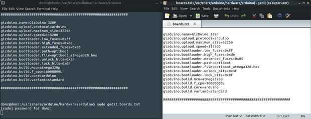 Para crear o modificar las tablas disponibles en el IDE de Arduino, necesitamos actualizar el archivo boards.txt ubicado en /usr/share/arduino/hardware/arduino e incluir las líneas GizDuino.