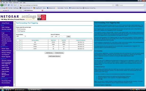 Una vez adentro, usted necesita encontrar el Port Forwarding. Mi Netgear tiene derecho en la columna de lado, no está seguro acerca de otras marcas. Desde aquí usted puede ir a trabajar. Usted necesitará saber la IP local del servidor PC (usted puede encontrar esta haciendo clic derecho sobre el icono de red en la esquina superior derecha de la pantalla, el icono con dos PC, y seleccionar la información de conexión, es el campo "Dirección IP").