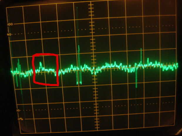 La primera foto es de un solo "evento" medido a 200 microsegundos por centímetro. La segunda foto es en una escala de tiempo mucho más largo... 1ms/cm si recuerdo bien. Por desgracia hay bastante ruido, pero todavía se puede ver que hay algunas desviaciones muy estocásticos en el ruido. Uno de los eventos es un poco más grande que el resto y puede indicar la coincidencia de dos acontecimientos. Tomó un esfuerzo para encontrar tal cosa, como en escalas de tiempo más largo los eventos son difíciles de ver. Los picos gigantes son artefactos de mi envejecimiento osciloscopio pero indispensable.