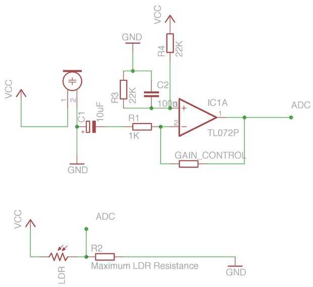 A continuación se suministran diagramas de ambos sensores. Vuelva a colocar el resistor GAIN_CONTROL con una resistencia variable o potenciómetro ideal. El opamp es alimentado por el riel de 5V.