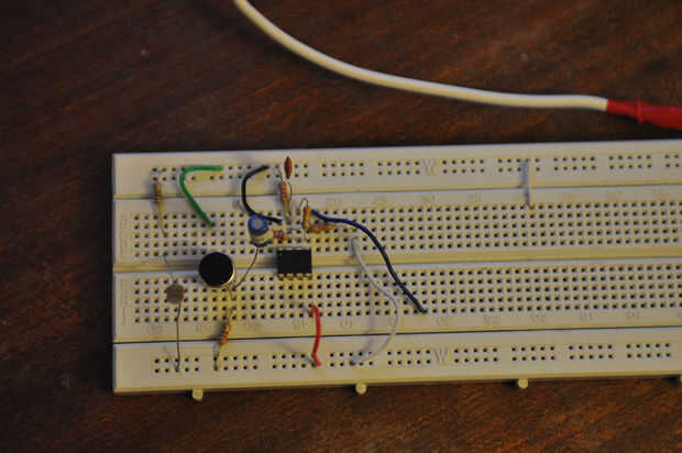 El opamp puede ser alimentado desde el + 5V carril (como puede el electret) o de una batería de 9V separado. El electret de la línea de 5V de la energía, puede utilizar más pero Compruebe la ficha técnica del opamp para ver cuál será la tensión de salida máxima - no siempre quiere dar una entrada para el AVR de más de 6 voltios - y es un desperdicio darle nada más 5 de todos modos (ya que el sensor sólo 10 bits). OpAmps tiene lo que se llama una oscilación tensión, el rango que te producen una salida. Esto es normalmente el voltaje de entrada menos un par de voltios cualquiera de los extremos. Por lo tanto, para mí con un carril de alimentación de 5V, termino desencadenando en alrededor de 600-700-el opamp simplemente no produce una salida mayor. Aquí es donde la ganancia ajustable viene en él.