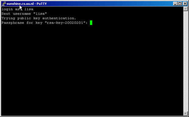 OpenSSH (Open Secure SHell) debe ser su arma de elección cuando se conecta a su nuevo anfitrión de FreeBSD. Es seguro, incluye por defecto con el sistema operativo, y hay cualquier cantidad de clientes que puede utilizar para conectar con ella. Máquinas Linux tendrá ssh por defecto, los usuarios de windows pueden conseguir masilla (www.chiark.greenend.org.uk/ ~sgtatham/putty/).