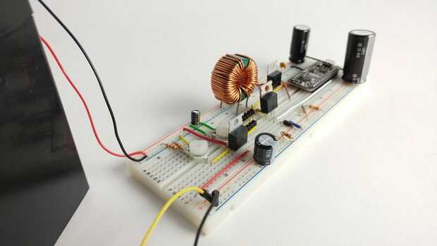 - Recuerde utilizar los carriles de la energía en el protoboard a su ventaja. He utilizado el carril positivo superior como la batería de 12V de entrada y el barandal inferior como la salida del circuito de impulso.