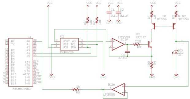 Por supuesto, Q3 es un actual fregadero y lo que queremos es una actual fuente, bomba de corriente en el LED por lo que su tensión se puede medir. Q1 y Q2 realizan esta función de respuesta. IC2A y R5 la tensión detectada del almacenador intermediario y protegen la entrada a la Arduino.