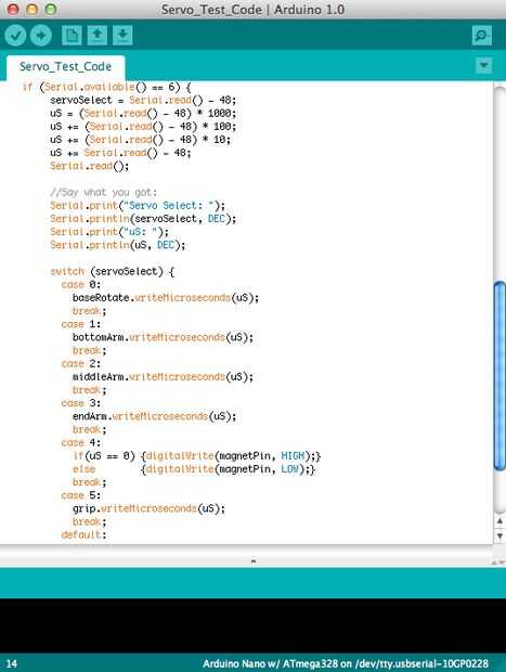 Además de transmitir un ángulo, también enviamos un número para seleccionar que servo (o pinza) para escribir. Tenga en cuenta que el código no está diseñado para recibir un ángulo y escribir ese ángulo en los servos, pero en su lugar se modifica para leer un número en microsegundos a servo. Esto se hace porque algunos servos no utilizan 1000uS estándar - 2000uS ángulo de codificación y es más fácil para que el código del lado del equipo arreglar esto y hacer los cálculos necesarios.