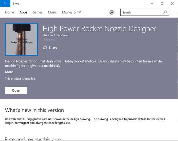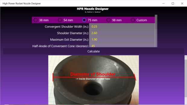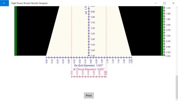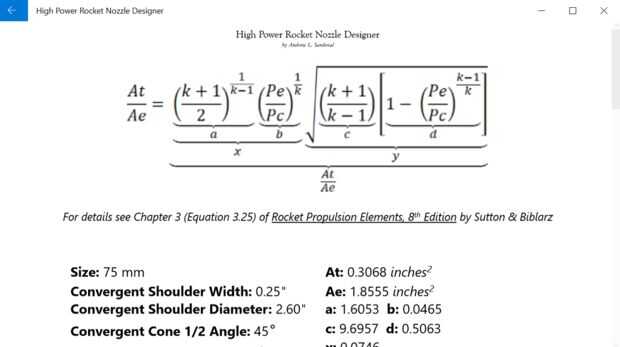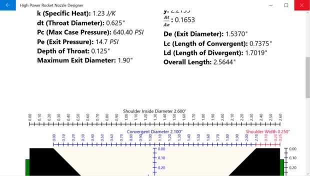 Si usted no tiene acceso al dispositivo de Windows 10 (p. ej., escritorio, teléfono o tablet), pide prestado uno o actualizar! Por otra parte, he adjuntado una hoja de cálculo producido por mi amigo y mentor en todo cohetes, Raymond Kinsel. Esta es la hoja de cálculo que usé para hacer la boquilla que se muestra en las fotos durante el vuelo. Hice la aplicación universal de Windows 10 sólo en la preparación de este artículo. He seleccionado 10 de Windows, ya que como programador había todavía no escrito una aplicación Universal de 10 de Windows en C++. En el futuro puedo volver puerto este Windows 8 o incluso OS X o iOS, pero por ahora esto es lo! Producción de una aplicación, independientemente de la plataforma lleva una cantidad sustancial de trabajo, sin importar lo simple la aplicación. Siempre hay trucos con IU, siempre. Impresión bajo Windows 10 no es tan sencillo o simple como debe ser, o como es con la impresión de Win32 GDI, ya que parece estar diseñado para imprimir el contenido de la pantalla sin el conocimiento de las características del dispositivo como DPI. Por supuesto, que probablemente mejorará en el tiempo, o bien mejora mi conocimiento de cómo debe para funcionar y así algún día incluso seré capaz de producir dibujos uno a uno en el listado.