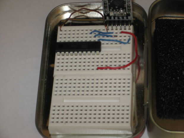 A continuación, encontrar un lugar adecuado en tu protoboard y coloque el chip y el convertidor (aviso que en mi protoboard ATtiny, el convertidor está conectado a la parte superior - hacia la bisagra de la caja de Altoids - con pin 1 en la parte superior de la placa). En el PDK Arduino, el convertidor tuvo que ser enchufado en la segunda placa. Ahora, usando cables cortos, solo "conectar los puntos." Es una buena idea utilizar colores diferentes para los diferentes tipos de señales. En mi protoboard te darás cuenta que usé rojo y negro (ok, por lo que es realmente marrón - pretend) para la + 5V y tierra. Hubiera sido mejor si había utilizado diferentes colores para reset y los cables de datos, pero no tengo disponibles mientras haciendo este instructable. Me salté el pin 2 en el conversor, ya que no necesito + 3.3V para este kit.