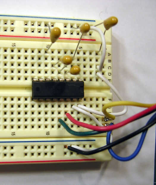 5. ejecutar + 5V al pin 16 (parte superior derecha) y en el medio Coloque el lado positivo del condensador y negativo a masa.