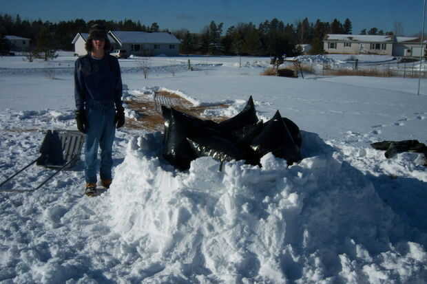 Hemos aprendido en los años que si usted infla las bolsas de basura con aire, acumulan en el centro de su quinzhee y luego entierran con nieve, ahorrarse un montón de tiempo[*]. Cuando llega el momento de hueco su montículo de nieve hacia fuera, que solo estallar todas las bolsas de basura y 'oila!' su quinzhee es hueco. No necesitan pasar horas cincelando la nieve hacia fuera a mano.