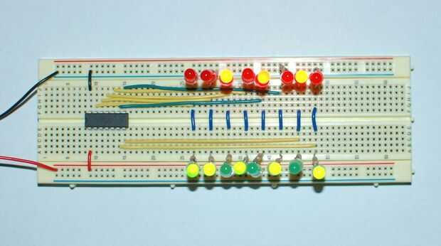 Este programa muestra lo fácil que es escribir un contador binario que cuenta hacia arriba y hacia abajo al mismo tiempo. El rojo LED cuentan para arriba mientras la cuenta verde de LEDs abajo.