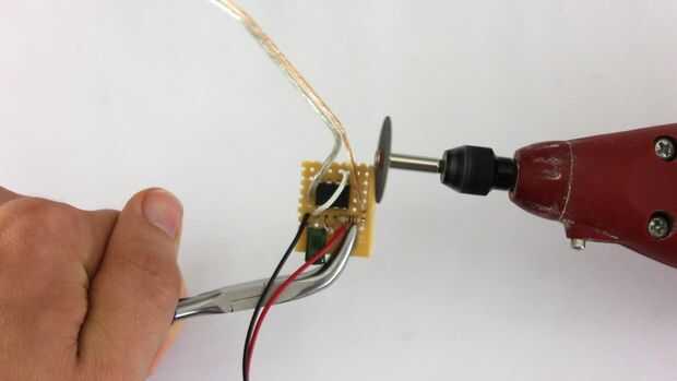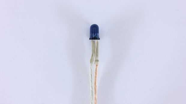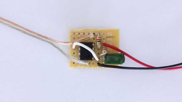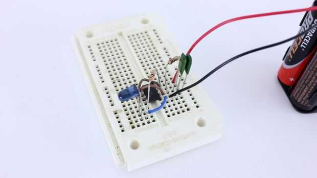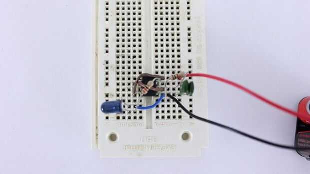 Decidí conectar el LED con los cables de puente largo. De esa manera tendría más opciones en cuanto a donde yo sería capaz de montar el resto del circuito. Por ejemplo, podría mantener la batería y el circuito en el bolsillo y el LED se esconden dentro de la manga o en un guante.