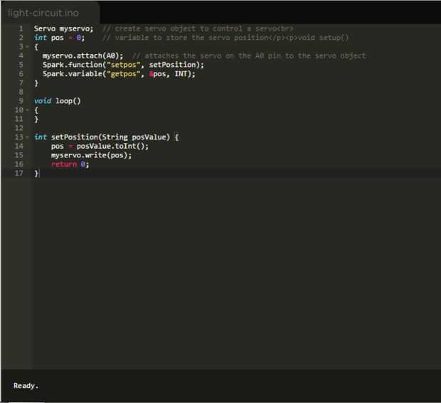 Servo myservo; // create servo object to control a servo<br> int pos = 0; // variable to store the servo position</p><p>void setup() { myservo.attach(A0); // attaches the servo on the A0 pin to the servo object Spark.function("setpos", setPosition); Spark.variable("getpos", &pos, INT); } void loop() { } int setPosition(String posValue) { pos = posValue.toInt(); myservo.write(pos); return 0; } Observe que la función loop() no tiene ningún código, ya que está todo tomado cuidado por nosotros y todo lo que tenemos que hacer es llamar a la función spark.variable() y la spark.function(). Si esto se hizo utilizando un Arduino una conjunto gran parte del código tendrá que escribirse allí para comenzarla.