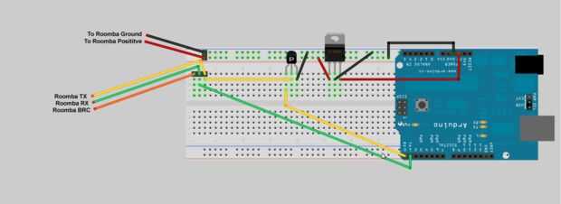 En su escribir de la Roomba biblioteca para Arduino, Mike McCauley consejos nosotros que debemos utilizar un transistor PNP para activar el Arduino de pin RX de la Roomba. Utilice un puente para conectar el pin de TX de Roomba del cable con el conector de la Base del transistor. Conectarse el pin del colector del transistor a tierra y el pin del emisor el RX del Arduino.