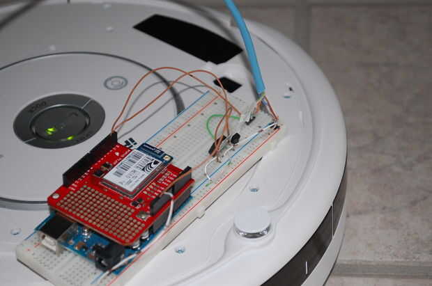 A continuación tenemos un pequeño problema. Potencia de la Roomba puede ser hasta 20V cuando se está cargando. Mientras que el regulador de voltaje de Arduino puede manejar esto, el regulador de voltaje 3.3V de WiFly no. Tendremos que añadir nuestro propio circuito de regulación de voltaje a la placa. Para ello utilizamos un regulador de voltaje 7805 para llevar la tensión hasta 5V. Conectar la tierra de los 7805 a tierra, el pin Vin al poder de la Roomba y el Vout al pin de 5V de Arduino.