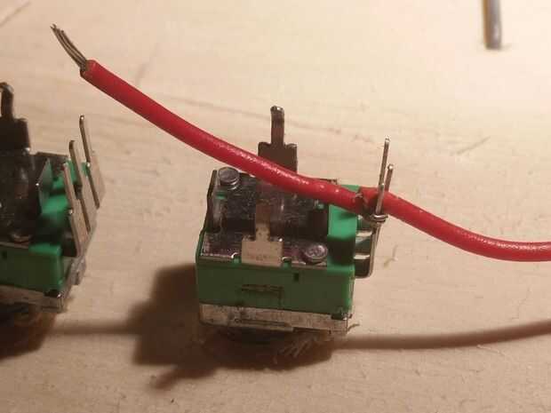 - Gire este pedazo de alambre desnudo alrededor de una de las patillas del segundo potenciómetro y soldar en su lugar. Hacer esto de tal manera que el limpiaparabrisas se conecta a la clavija con el cable rojo al girar el eje a la derecha (ver imagen 6).