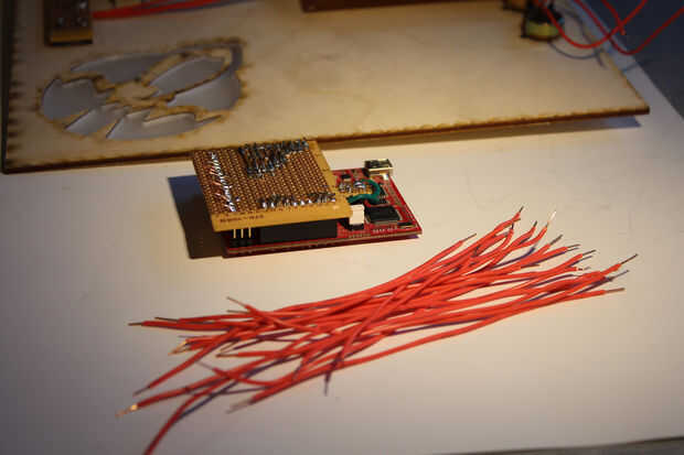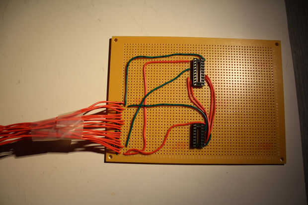 La mayor parte de la Junta está cableada conexiones a todos los otros controles del controlador DJ, pero los pocos componentes que actualmente pueblan la Junta son los zócalos de ICs y una resistencia única. El resto es todo! Soldar el zócalo del IC 20 pines en la parte superior del centro del tablero y luego soldar el zócalo del IC 16 pines debajo de él, dejando un hueco en el centro de la Junta de codificador rotatorio claro. No insertar el IC real todavía, calor de soldadura puede dañar! Luego soldamos los cables 17 para el escudo de Launchpad y comenzó a soldar algunas conexiones de. Asegúrese de que usted escriba lo que los cables de lo que será cuando el Launchpad! Suelde el otro extremo de estos cables para el escudo de Launchpad que hicimos anteriormente. Asegúrese de que alcanzará.