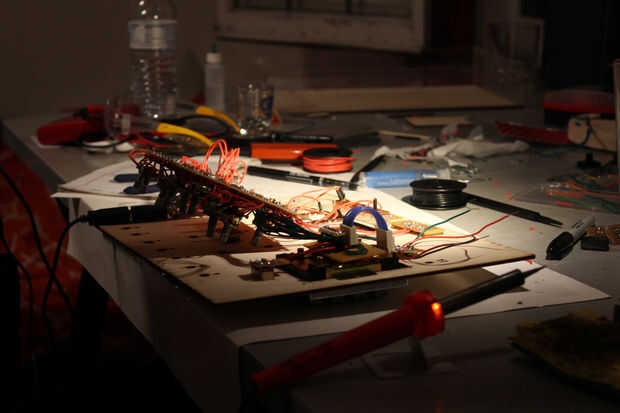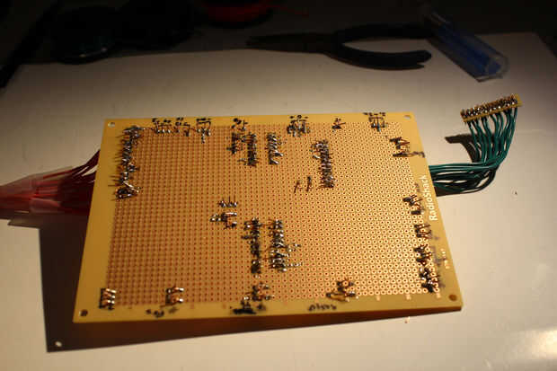 Aquí es donde sucede el resto de la diversión: todos los controles en el tablero principal de soldadura. Para empezar, corta todos los cables de los controles para que lleguen sin un montón de alambre extra (deje un poco floja), especialmente los potenciómetros cerca de la posición de montaje de la placa principal. Tira de forma adecuada y empezar a posicionamiento sus cables en el tablero, por lo que no entran en conflicto. Puede tratar de conectar directamente los controles donde deben estar, pero también se puede utilizar un poco de cable de puente.