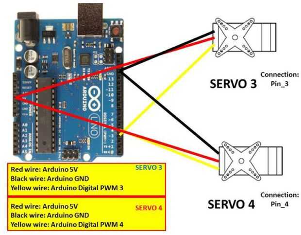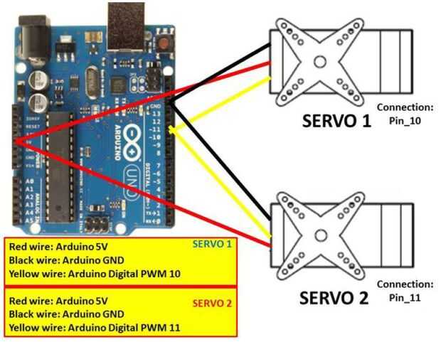 Conexiones de servo 1: cable rojo: Arduino 5V, cable negro: Arduino GND, cable amarillo: Arduino PWM Digital 10