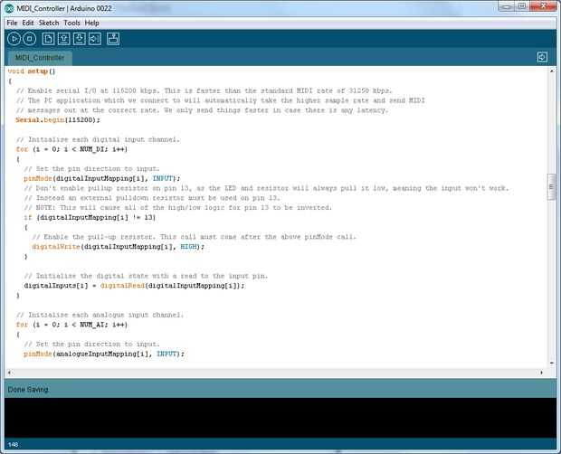 Descargar el adjunto dibujo y subirlo a tu Arduino. El código se ha documentado para que pueda ver lo que está sucediendo. En pocas palabras el código continuamente encuestas de todas las entradas digitales y analógicas para cambios. Si se detecta un cambio presionó un botón o un control deslizante se trasladó, se envía un mensaje de MIDI correspondiente a la entrada a la PC.