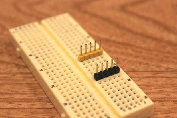 Puesto que vamos a hacer múltiples conexiones a + 5V y GND, se suman algunos encabezados adicionales en el protoboard para conectarse. Me pareció que teniendo cinco encabezados para cada uno + 5V y GND funciona bien para este proyecto.