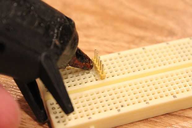 Para conectar las cabeceras, simplemente empuje dos filas de cinco cabeceras (una fila por cada uno) a través de la protoboard (hacer que entra los conectores de metal). Luego conectar una fila a la Arduino de GND y la otra fila a + 5V. Asegúrese de que usted asegure estas cabeceras con pegamento caliente antes de ir ya que si cae, todo el proyecto dejaría de trabajar.