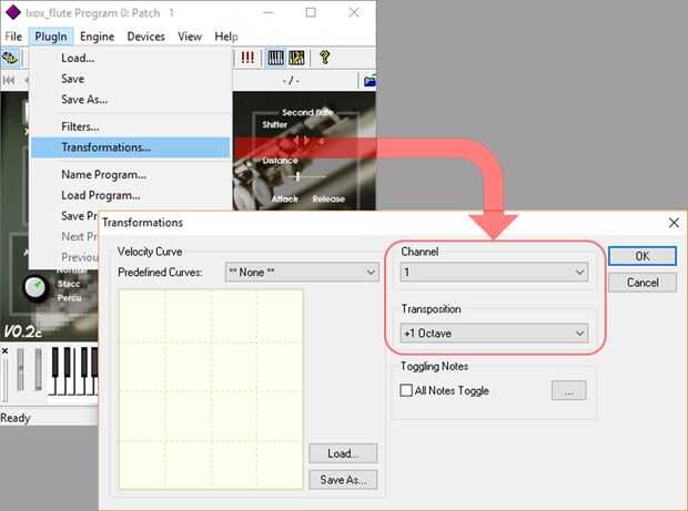 Nota: Me di cuenta que el plugin de Lxox_Flute no tiene sonido en las octavas bajas. Arduino 'Oct' variable se establece en la octava 5 que funciona en mi configuración. Si esto no funciona en su configuración (improbable) puede cambiar el Arduino 'oct' variable o transformar la octava VSTHost menú 'PlugIn' > submenú 'transformación' > 'canal' el valor '1' > set 'transposición' a '+ 1 octava' (ver segunda foto).