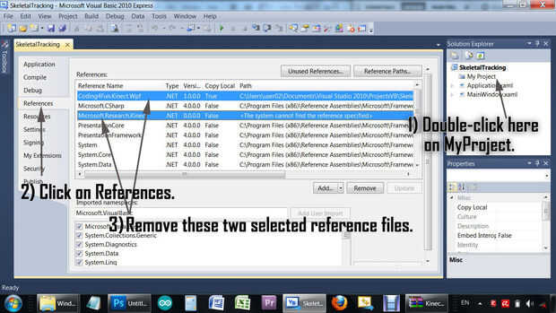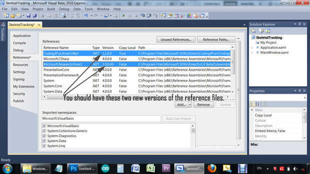 Los archivos del proyecto SkeletalTrackingVB que han extraído tienen viejos archivos de referencia de un conjunto de herramientas de SDK de Kinect y Code4Fun mayores. Tenemos que eliminar las referencias antiguas y luego añadir los últimos.