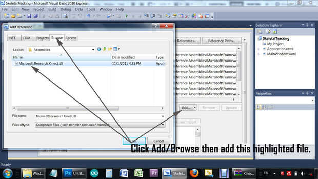 -Buscar y agregar las nuevas versiones de los archivos que hayas descargado una parte de la más reciente Microsoft Kinect SDK y archivos zip de Coding4Fun Kinect Toolkit. Como de la redacción de esta guía, las versiones de Code4Fun.Kinect.wpf deben ser 1.1.0.0 y Microsoft.Research.Kinect 1.0.0.45