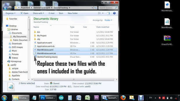 -Descarga mi MainWindow.xaml y MainWindow.xaml.vb (se encuentran en el archivo adjunto techbitar.zip) que he adjuntado a esta guía y copiar encima de los que se han extraído en la carpeta SkeletalTrackingVB\SkeletalTracking o corte y pega su contenido en los archivos extraídos con el mismo nombre.